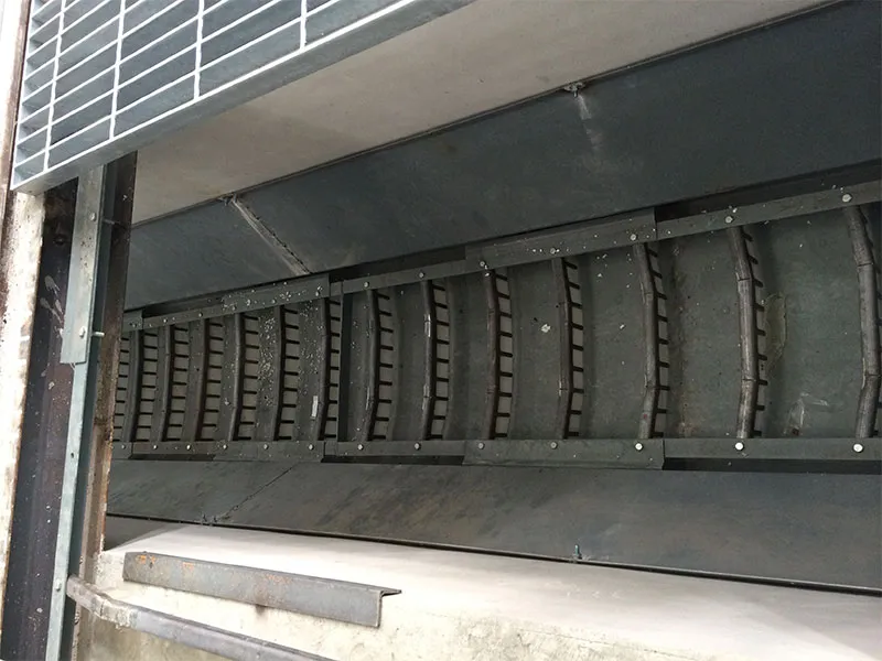 - Поперечные скребковые конвейеры в этих каналах транспортируют материал к входу элеватора.