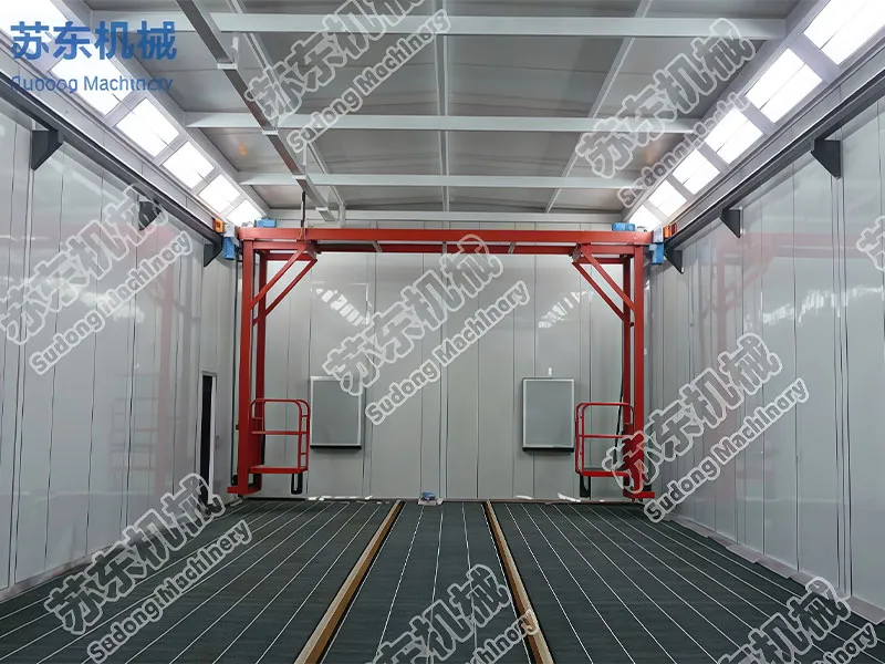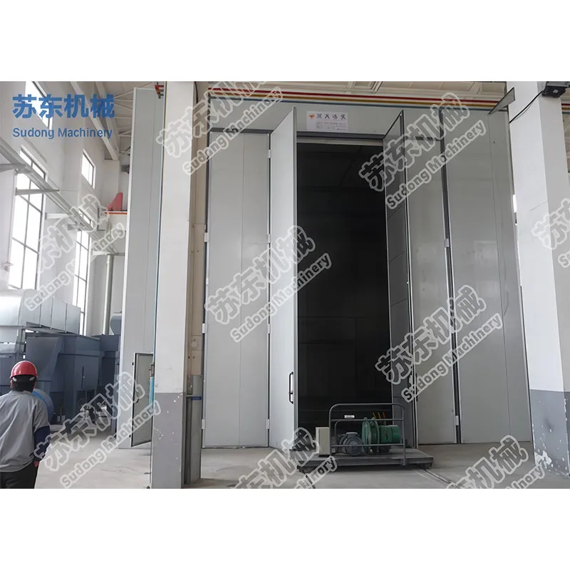 1. Система дробеструйной камеры включает в себя корпус камеры, устройства шумоподавления, рабочую платформу, систему освещения, тележку, большие и малые двери, смотровое окно, дробеструйный аппарат и пистолет для сдувания.
