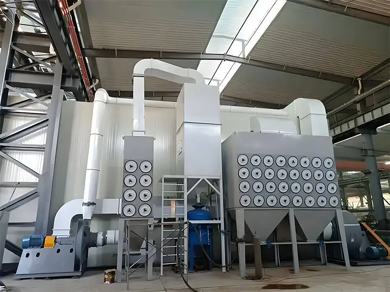 7. Примеси и пыль, отделенные от абразива в сепараторе, переносятся воздушным потоком в пылесборник. После двухступенчатой очистки от пыли примеси и пыль попадают в бункер для сбора пыли и собираются автоматическим устройством для сбора пыли. Чистый воздух проходит от поверхности фильтрующих картриджей во внутренние выпускные отверстия, а затем выбрасывается в атмосферу через вентилятор через дымоход.