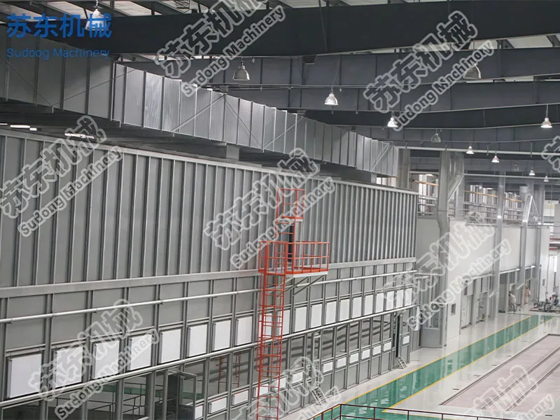 Принцип работы сухой окрасочной камеры: наружный воздух фильтруется через фильтр грубой очистки и подается вентилятором к потолку окрасочной камеры. После регулировки выравнивателем потока и прохождения через высокоэффективный фильтр тонкой очистки на потолке воздух равномерно подается в камеру, двигаясь сверху вниз ламинарным потоком. В этом состоянии содержание пыли в воздухе составляет ≤1,5 мг/м³, максимальный диаметр частиц ≤5 мкм.