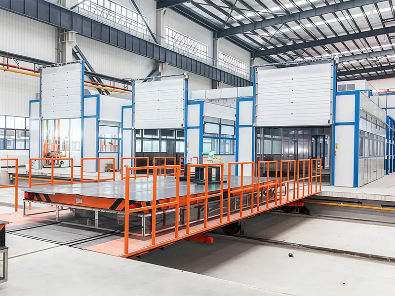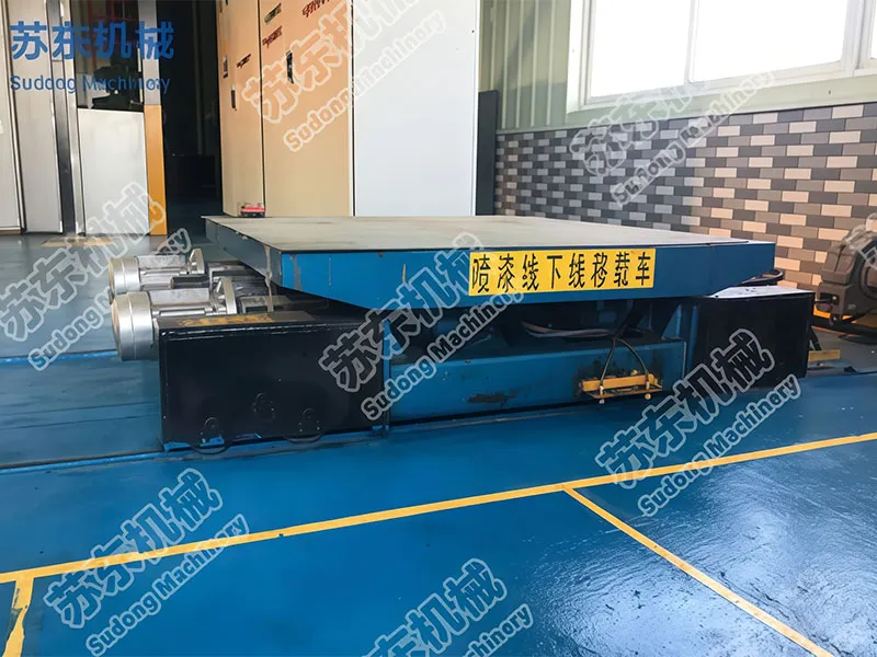 Тележка поперечного перемещения является вспомогательным оборудованием, предназначенным для операций транспортировки крупных и средних заготовок, таких как автобусы, локомотивы и другие. Обладает такими характеристиками, как высокая жесткость, компактная конструкция, рациональная компоновка, удобство управления и безопасность эксплуатации, представляет собой наиболее идеальное специальное транспортное оборудование для снижения трудоемкости и повышения эффективности работы. Тележка поперечного перемещения управляется сопровождающим персоналом с помощью кнопок, автоматически позиционируется на рельсах. После позиционирования на рельсах вертикальная напольная цепь тележки поперечного перемещения взаимодействует с транспортировочной цепью на земле, совместно обеспечивая процесс передачи заготовки с земли на тележку поперечного перемещения и с тележки поперечного перемещения на землю.